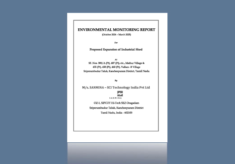 SANMINA, CHENNAI October 08, 2025 – Document related to EC grant and Half-Yearly Compliance report against the EC Identification number. EC24C3806TN5270524N, Dated: 21-Sep-2024 for the “Proposed Expansion of Industrial Shed” at SF. Nos. 388/A (Pt), 407 (Pt), etc., Mathur Village & 455 (Pt), 458 (Pt), 460 (Pt), Vallam -B Village, Sriperumbudur Taluk, Kancheepuram District, Tamil Nadu.